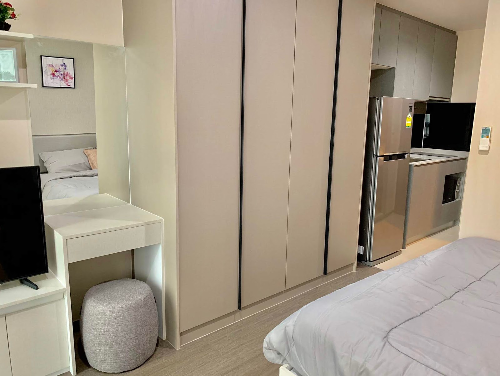 ห้อง สตูดิโอ ขนาด 25 ตร.ม. 1 ห้องนอน 1 ห้องน้ำ ชั้น 28 อาคาร A วิวสระน้ำ ทิศใต้ เห็นแม่น้ำเจ้าพระยา ฝั่งบางนา ตกแต่งครบ พร้อมเข้าอยู่ มีรายละเอียดเฟอร์นิเจอร์ และเครื่องใช้ไฟฟ้า ดังนี้